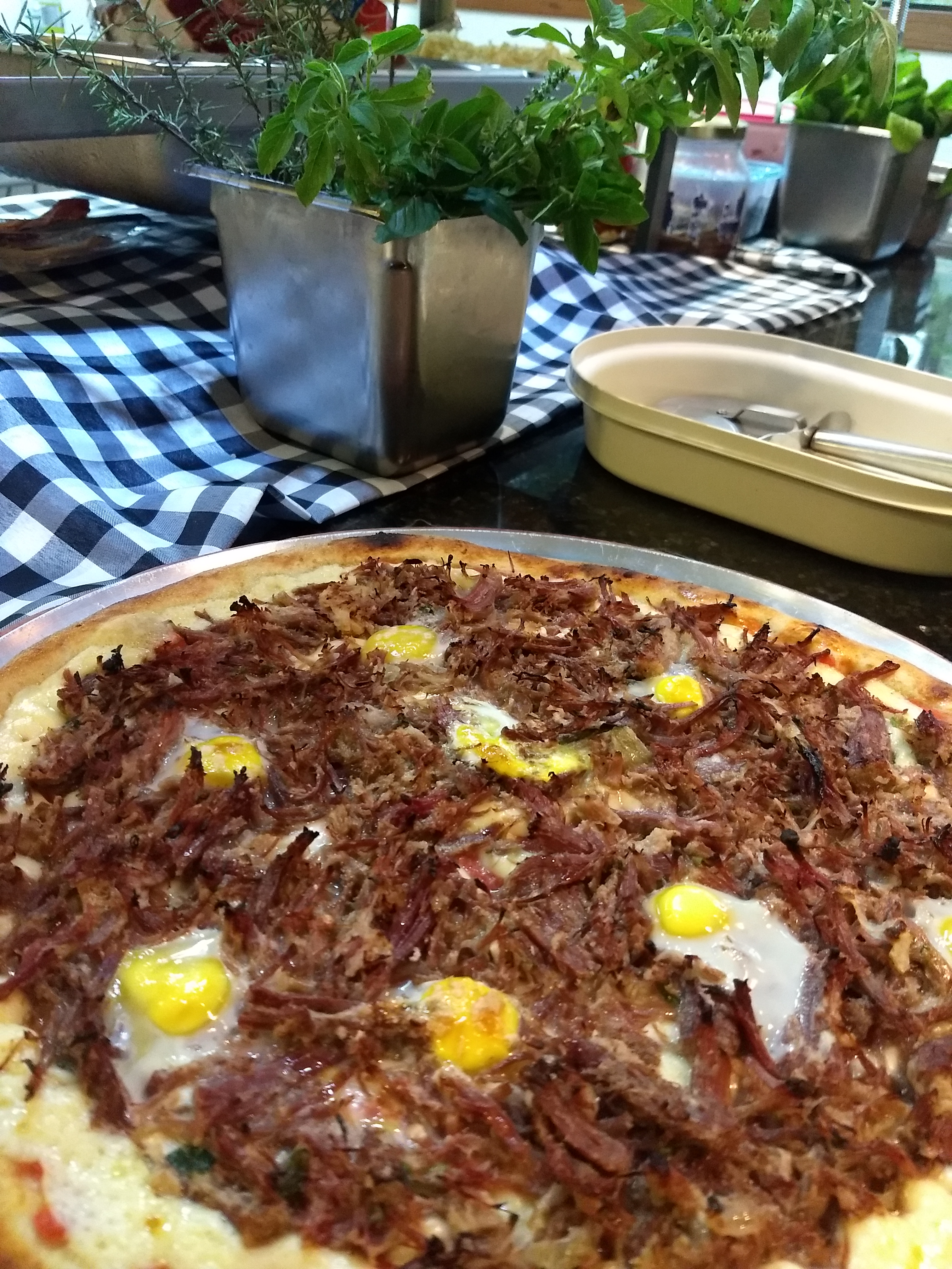 | Presunto de peru, molho de tomate, ovos, champignon, coberta com mussarela |